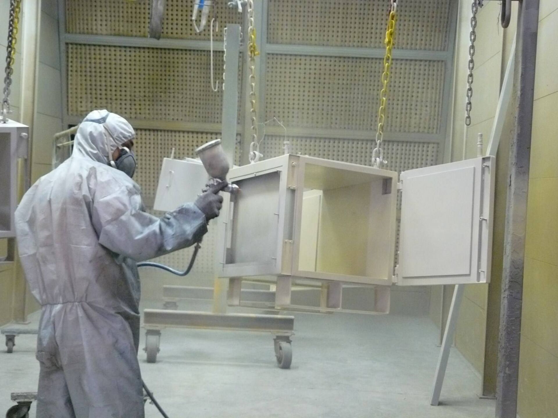 La société SD Peinture située à Mallemort, dispose d'une cabine pour la mise en peinture liquide de 9.5m par 4m et 3m de hauteur. Grâce à un système de palonnier nous pouvons prendre en charge des pièces allant jusqu'à 2 Tonnes.