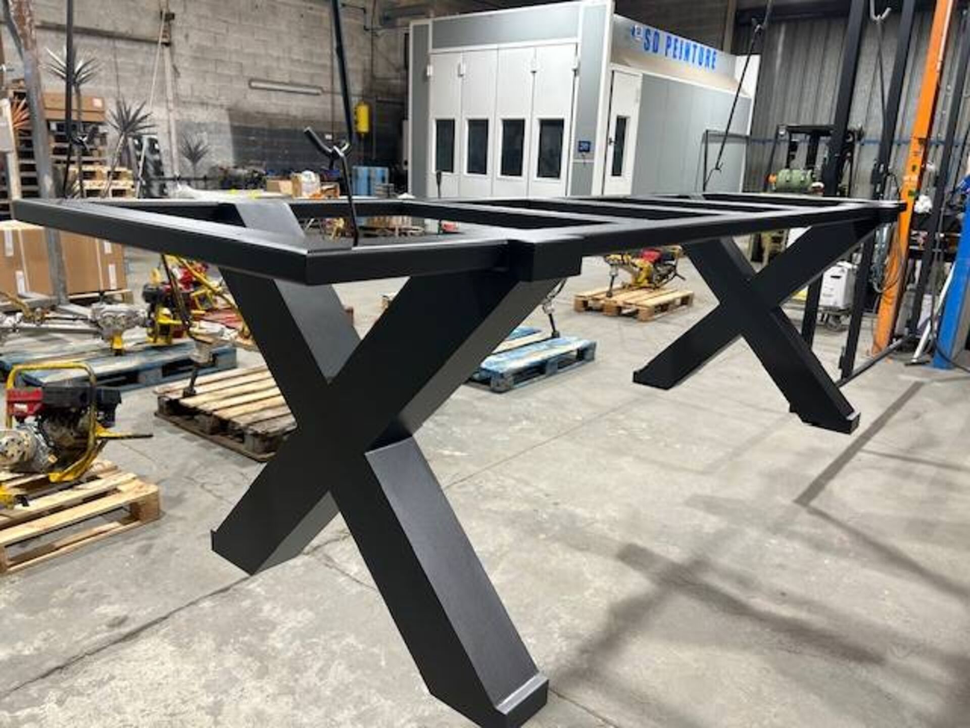Notre équipe a procédé au grenaillage de la pièce dans sa totalité afin d'éliminer la rouille, la calamine ect... avant l'application d'un primaire et d'une finition en thermolaquage selon la teinte choisie par le client, ici un NOIR 9005 FINE TEXTURE. Le client, recouvrira par la suite, ce pied de table par un très beau plateau en bois.