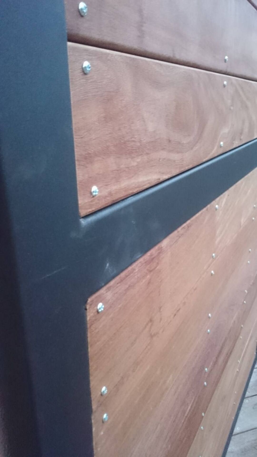 Notre équipe a procédé à un grenaillage du cadre acier afin de préparer la matière avant peinture en éliminant la rouille, la graisse etc...nous avons ensuite appliqué un primaire de protection et d'accroche en thermolaquage pour terminer par une couleur de finition également en thermolaquage teinte gris anthracite RAL 7016 MAT. Notre client a pu ensuite assembler les pièces en bois avant de procéder à l'installation.